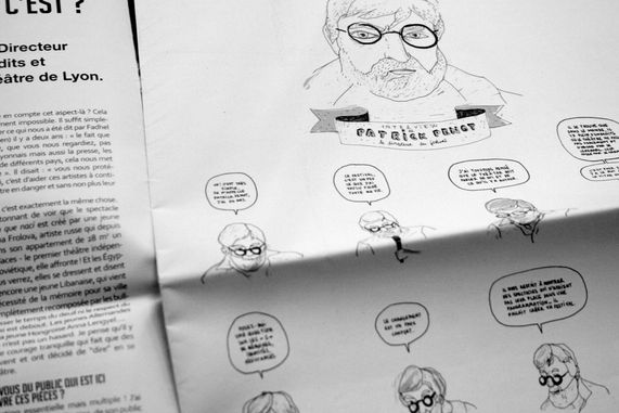 Illustrations et planches de bande-dessinée présentant les différents spectacles du festival de théâtre politique international Sens Interdit dans le journal International.